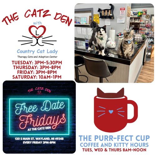 Find your new favorite place and meet some adorable cats at The Catz Den, a cozy cat cafe featuring therapy cats from The Country Cat Lady. Enjoy a delicious cup of coffee during The Purr-fect Cup Coffee and Kitty Hours for cat lovers. Teens can have plenty of fun and get freebies at the VIP Teen Program during the school year (Sept-May). We are located 15 mins south of Grand Rapids, Michigan