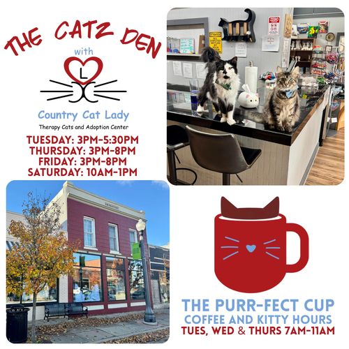 Find your new favorite place and meet some adorable cats at The Catz Den, a cozy cat cafe featuring therapy cats from The Country Cat Lady. Enjoy a delicious cup of coffee during The Purr-fect Cup Coffee and Kitty Hours for cat lovers. Teens can have plenty of fun and get freebies at the VIP Teen Program during the school year (Sept-May).