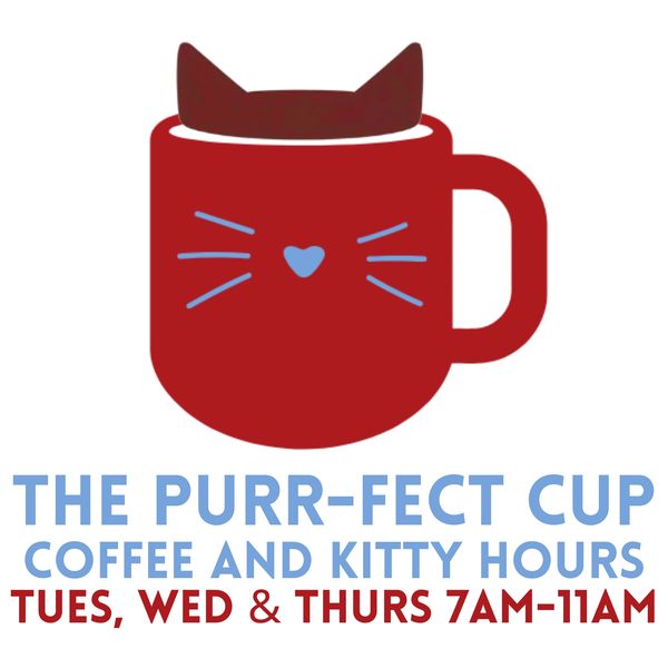 For just $5 you’ll enjoy a fresh cup of coffee, free WiFi, and lots of time hanging out with our adorable therapy cats in the lobby! The $5 goes directly towards costs for cat care and VIP teen activities! Plus, our boutique and snack store will be open, and you’ll be able to see all of the cats in our adoption room too. See our menu below!